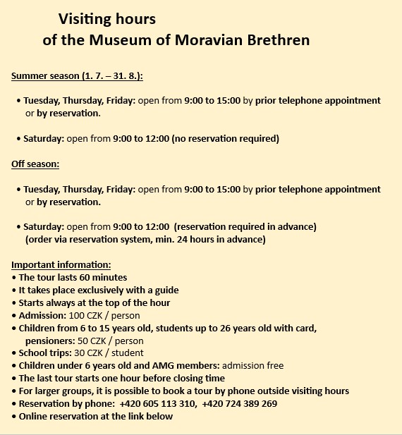 The museum gathers and has its own register of three-dimensional objects, especially those which relate to the topic of Moravian Brethren. Old prints, old objects of daily use, library with the topic of the Unity of the Brethren, archivals. If you want to present something to the museum, you will make happy not only us, but also the other visitors.
