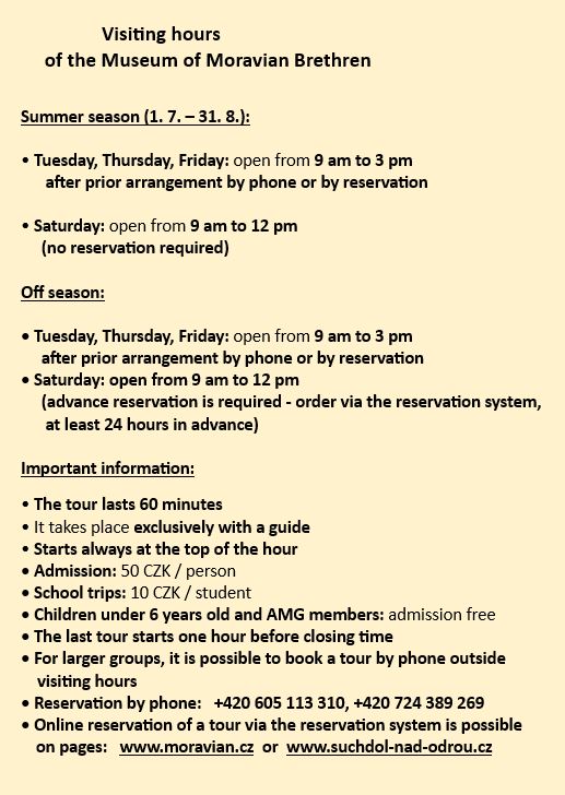 The museum gathers and has its own register of three-dimensional objects, especially those which relate to the topic of Moravian Brethren. Old prints, old objects of daily use, library with the topic of the Unity of the Brethren, archivals. If you want to present something to the museum, you will make happy not only us, but also the other visitors.